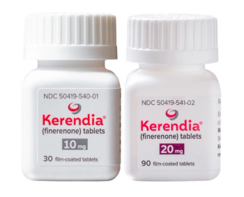 Finerenone (Kerendia) is indicated to reduce the risk of sustained eGFR decline, end stage kidney disease, cardiovascular death, non-fatal myocardial infarction, and hospitalization for heart failure in adult patients with chronic kidney disease.