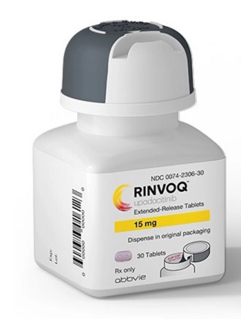 Upadacitinib (Rinvoq) is a Janus kinase (JAK) inhibitor being investigated to treat rheumatoid arthritis, Crohn disease, ulcerative colitis, atopic dermatitis, psoriatic arthritis, axial SpA giant cell arteritis, and Takayasu arteritis