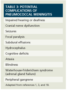 Research indicates that up to 15% of pneumococcal meningitis survivors suffer significant neurologic complications even if antimicrobial therapy cures the underlying meningitis. Patients who present with severe neurologic impairment or rapid-onset illness have a risk of death that is between 50% and 90%, even with treatment.9 Close monitoring for complications is crucial. Table 3 lists possible complications.