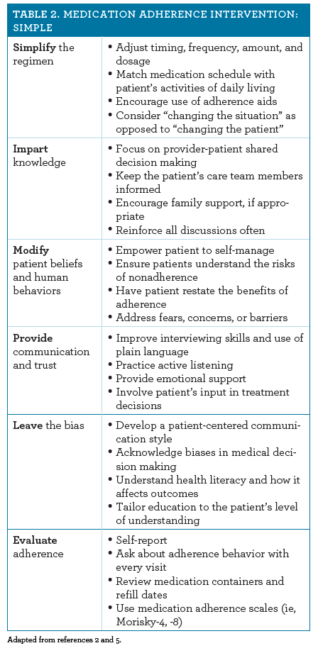 The World Health Organization has proposed 5 interacting dimensions that affect adherence (Table 1).2,4 Strategies to enhance medication adherence include a series of interventions known by the acronym SIMPLE (Table 2).2,5 These strategies are typically incorporated into medication therapy management (MTM) services. MTM services have become widely recognized as an integral and vital part of patient care, with improvements being shown in clinical, economic, and humanistic outcomes.6