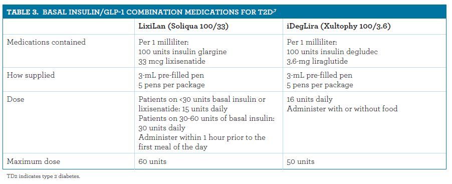 Lixisenatide (Adlyxin), a new GLP-1 RA, was approved in 2016. However, its use as a monotherapy may be limited, as there are already many medications in its class on the market. Lixisenatide may prove to be more useful when used in combination with another GLP-1 RA (see Soliqua, discussed below) in patients who are not controlled on basal insulin alone. As a monotherapy, lixisenatide is available in two 3-mL pre-filled pens: a 50 mcg/mL green pen (with 14 pre-set doses, 10 mcg per dose) and a 100 mcg/mL burgundy pen (with 14 pre-set doses, 20 mcg per dose).27 The starter pack contains an initiation pen and a maintenance pen, as lixisenatide should be initiated with 10 mcg administered as a subcutaneous injection once daily for 14 days, after which the dose should be increased to 20 mcg once daily.27