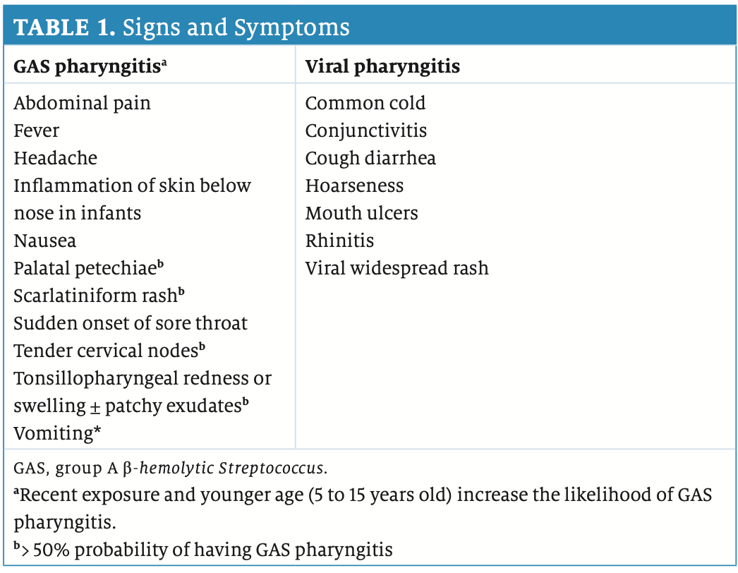 Streptococcal pharyngitis, commonly referred to as strep throat, is caused by Streptococcus pyogenes, group A β-hemolytic Streptococci (GAS).1,2 GAS is responsible for fewer pharyngitis cases than viruses are (adults: 5%-15%, children: 20%-30%).1-3 Strep throat spreads through direct contact with respiratory fluids and has an incubation period of 2 to 5 days.2,3 Its prevalence increases during the winter and early spring, accounting for 1% to 2% of all ambulatory care visits in the United States.2,4