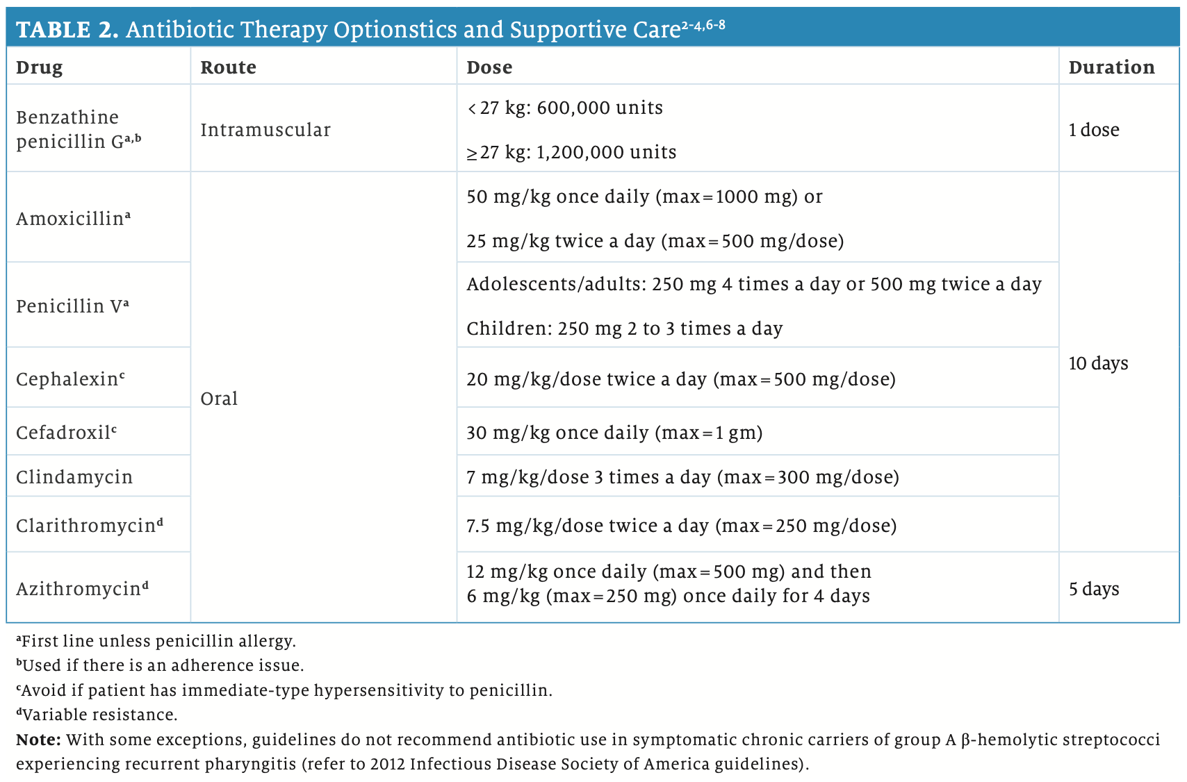 The Infectious Disease Society of America’s guidelines highly recommend antibiotic treatment in children who tested positive for strep throat. Treatment prevents nonsuppurative (eg, acute rheumatic fever [ARF], acute glomerulonephritis) and suppurative (eg, cervical lymphadenitis, mastoiditis, and peritonsillar abscess) complications.2,4 Adult patients often do not need antibiotics because the relief they provide is minimal. Symptoms are self-limiting and usually last less than a week.4 Table 22-4,6-8 summarizes antibiotic therapy options. Guidelines consider amoxicillin/penicillin as first-line therapy, followed by cephalosporins and macrolides/azalides in the presence of allergy to first-line agents. Avoid fluoroquinolones, sulfonamides, and tetracyclines because of high resistance rates, ineffectiveness, and/or unnecessary broad-spectrum coverage.2 Study results show that children experience more adverse events, notably gastrointestinal upset, when prescribed azalides/macrolides compared with β-lactam antibiotics. Rashes are more common with β-lactams.9